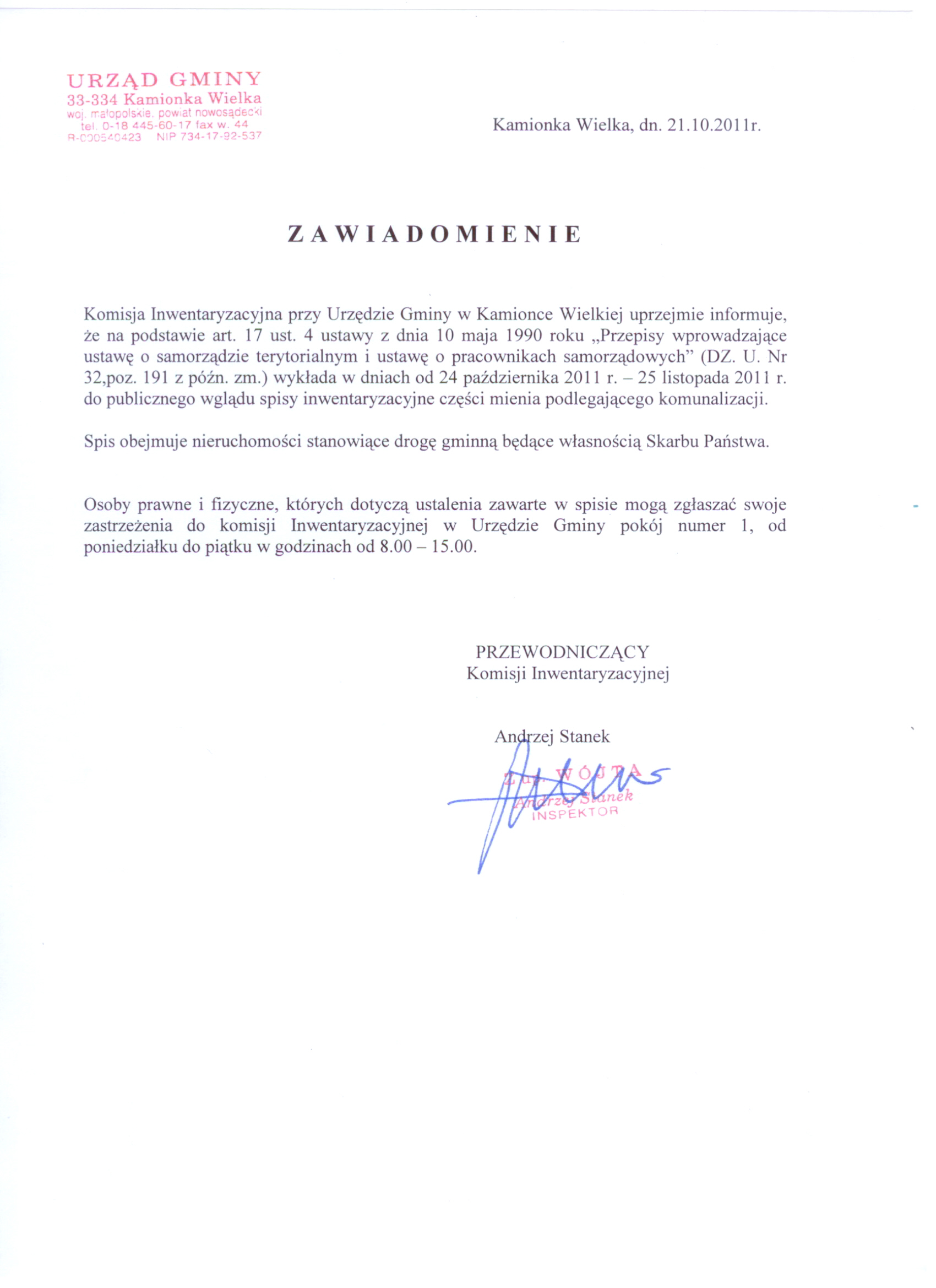 OBWIESZCZENIE Wójta Gminy Kamionka Wielka